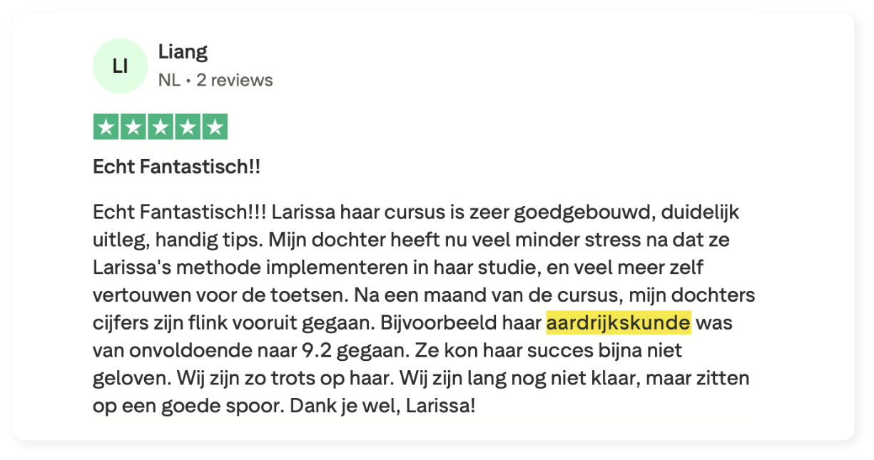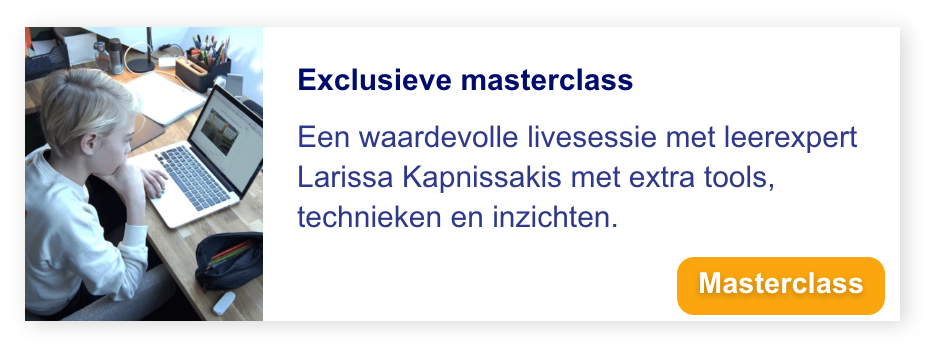 Tijdens het live webinar bespreken we de belangrijkste inzichten uit de challenge, beantwoorden we vragen van ouders en leerlingen, en deelt Larissa nog meer waardevolle tips en technieken. Het is dé kans om extra tips te krijgen van leerexpert Larissa Kapnissakis.